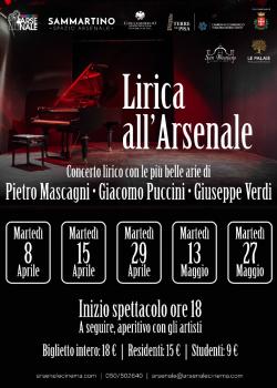 Appuntamento al cinema per godersi l’opera dal vivo. Le grandi pagine della lirica al Cineclub Arsenale di Pisa saranno eseguite live da soprani, tenori e baritoni, accompagnati dal pianoforte, per la nuova rassegna Lirica all’Arsenale. Ogni martedì alle 18, a partire dall'8 aprile, lo spazio cinematografico Sammartino si trasformerà in una sala d’opera pronta ad accogliere i capolavori ldella lirica.