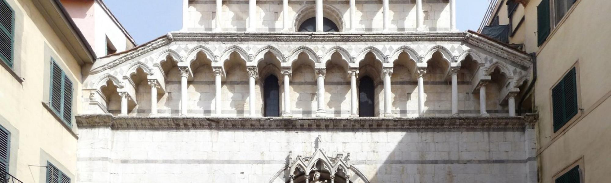 La facciata con paramento marmoreo è trecentesca, ed è caratterizzata nella parte inferiore da tre portali: il centrale è sormontato da un’edicola gotica, che incornicia la Madonna col Bambino, angeli e l'abate offerente di Lupo di Francesco (originali al Museo di S. Matteo), e da una parte superiore con tre ordini di loggette. Le scritte leggibili nella parte inferiore della facciata sono riferite ad un’elezione del Rettore dell’Università risalente ai primi anni del XVII secolo.