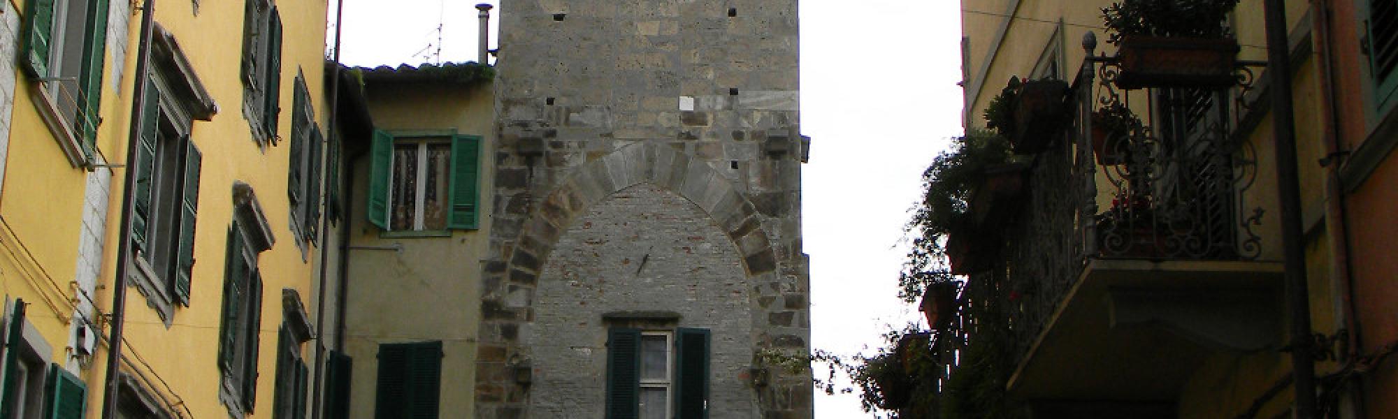 The most famous medieval building on Via Calvalca is the Torre dei Caciaioli, now known as Torre del Campano (from the bell that in the late 18th century summoned students to lectures at the university). This is a tall square building with pilasters culminating in a pointed arch in the western front, with smaller pointed arches on the other facades.