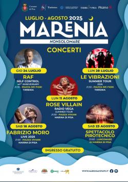 From Thursday, July 24 to Saturday, August 23, 2025 the great music will be protagonist with concerts in Tirrenia and Marina di Pisa. The concerts are part of the program of "Marenia NonSoloMare", an initiative promoted by the Department of Tourism of the Municipality of Pisa in collaboration with Pisamo, with the participation of the Chamber of Commerce North West and the involvement of Confcommercio Pisa, Confesercenti Pisa, Proloco Litorale Pisano, Teatrino del Sole and Eliopoli.