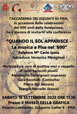 On Saturday 16 September at 5.30 p.m. at the Museo della Grafica, Palazzo Lanfranchi, there will be a concert to celebrate the 400th anniversary of the foundation of the Accademia dei Disuniti di Pisa.