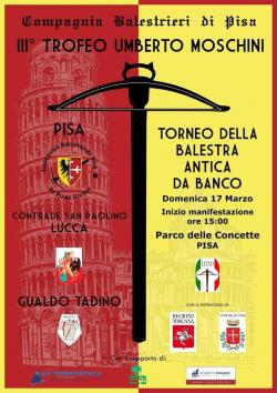 The Balestrieri di Pisa Company is organising, with the patronage of the Region of Tuscany and the Municipality of Pisa, the "III° Umberto Moschini Trophy": a triangular tournament with the Antique Crossbow between the cities of Pisa, Lucca and Gualdo Tadino.