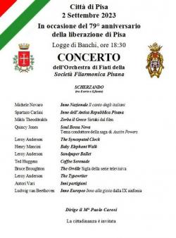 Saturday 2 September 2023 at 6.30p.m., on the occasion of the 79 anniversary of the Liberation of Pisa, will be held the Concert of the Wind Orchestra of the Società Filarmonica Pisana.