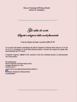 On the occasion of the extraordinary opening of the National Museum of the Royal Palace from 19.30 to 22.30, Moira Brunori textile restorer will guide visitors to the discovery of the secrets of 16th century Florentine fashion.