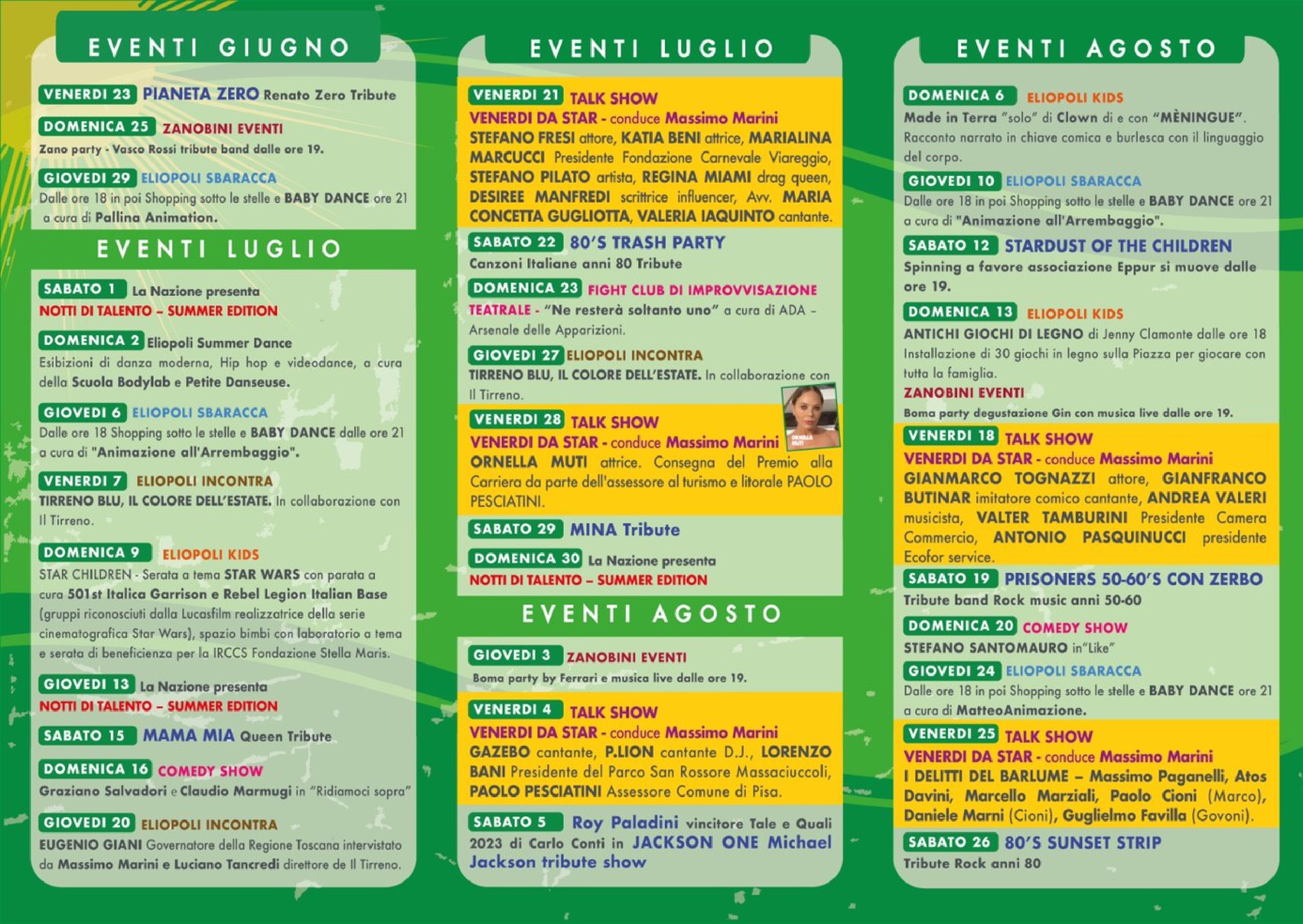Talk show Star Fridays: 21 and 28 July, 4 18 and 25 August. On stage will be, among others, Ornella Muti, Stefano Fresi, Gianmarco Tognazzi, Gazebo, Ubaldo Pantani, Katia Beni.