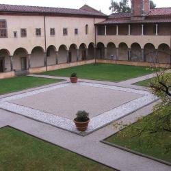 Convento di S. Croce in Fossabanda, il chiostro interno (Foto di G. Bettini)The Santa Croce complex, founded in 1324, on a pre-existing 13th century building near a reclamation canal from the tenth century located in the lands of a certain Bando (mentioned in the eleventh century), is today entrusted to the order of friars minor, while the large cloister was used, in the last years of the twentieth century, as an accommodation facility. The entrance orch from the fifteenth century has been attributed to Michelozzo, one of the greatest representatives of the Italian Renaissance. The interior of the Church is simple, with a single hall divided into four spans with cross vaults. On the high altar stands the Enthroned Madonna with musician angels by Alvar Pirez d'Evora, from the 15th century.