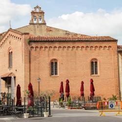 Toda la estructura está construida en ladrillo. Una muralla de pequeños ladrillos rojos ritma la fachada en forma de cúspide, movida por una serie de pequeños arcos ciegos y por una bífora. Dentro del luneto que domina la puerta de acceso encontramos un fresco de la Sagrada Familia (1932), pintado en el estilo del siglo XIV por Curzio Rossi. También el lado derecho de la iglesia está decorado con pequeños arcos ciegos y bíforas. Encima de la cubierta se levanta la espadaña.