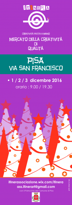 Nei mesi di novembre e dicembre, nel cuore del centro storico di Pisa, potrete visitare il Mercato della Creatività di Qualità dell’associazione Itinera. Durante gli eventi un gruppo di talentuosi artisti e artigiani esporrà e venderà le proprie opere interamente realizzate a mano. Potrete scoprire delle piccole opere d’arte realizzate con grande fantasia e maestria da pittori, ceramisti, vetrai, rilegatori e da tanti altri bravi artigiani. È un’ottima occasione per trovare originali pezzi unici da regalare a Natale a famiglia e amici. Non perdete l’occasione di farci un giro il 19 e 20 novembre sotto le bellissime Logge dei Banchi e il primo weekend di Dicembre (dal giovedì al sabato) nella centralissima Via S. Francesco.