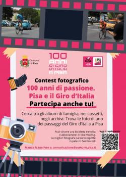 Il contest fotografico “100 anni di passione. Pisa e il Giro d’Italia” è promosso dal Comune di Pisa senza alcun scopo di lucro, allo scopo di promuovere l’appuntamento del 20 maggio 2025 quando Pisa sarà città di tappa della 108^ edizione del Giro d’Italia. L’ultima volta era accaduto nel 1980 e la prima volta che Pisa aveva ospitato il Giro era accaduto nel 1925, esattamente 100 anni fa.