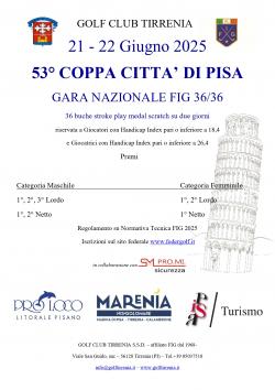 Sabato 21 e domenica 22 giugno 2025, il Golf Club Tirrenia ospiterà la "53° Coppa Città di Pisa", GARA NAZIONALE FIG 36/36 36 buche stroke play medal scratch su due giorni riservata a Giocatori con Handicap Index pari o inferiore a 18,4 e Giocatrici con Handicap Index pari o inferiore a 26,4.