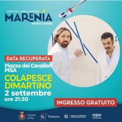 In programma il 18 agosto scorso in piazza delle Baleari a Marina di Pisa ma annullato per maltempo, il concerto di Colapesce e Dimartino sarà recuperato lunedì 2 settembre alle ore 21.30 e, per motivi organizzativi, si terrà in città nella prestigiosa Piazza dei Cavalieri che già ospita il “Pisa Summer Knights”.