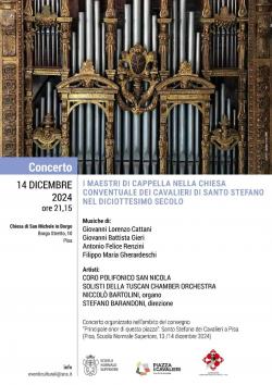 Sabato 14 dicembre alle ore 21:15 si terrà il concerto "I maestri di cappella nella chiesa conventuale dei Cavalieri di Santo Stefano nel diciottesimo secolo" nella Chiesa di San Michele in Borgo (Borgo Stretto, 10).