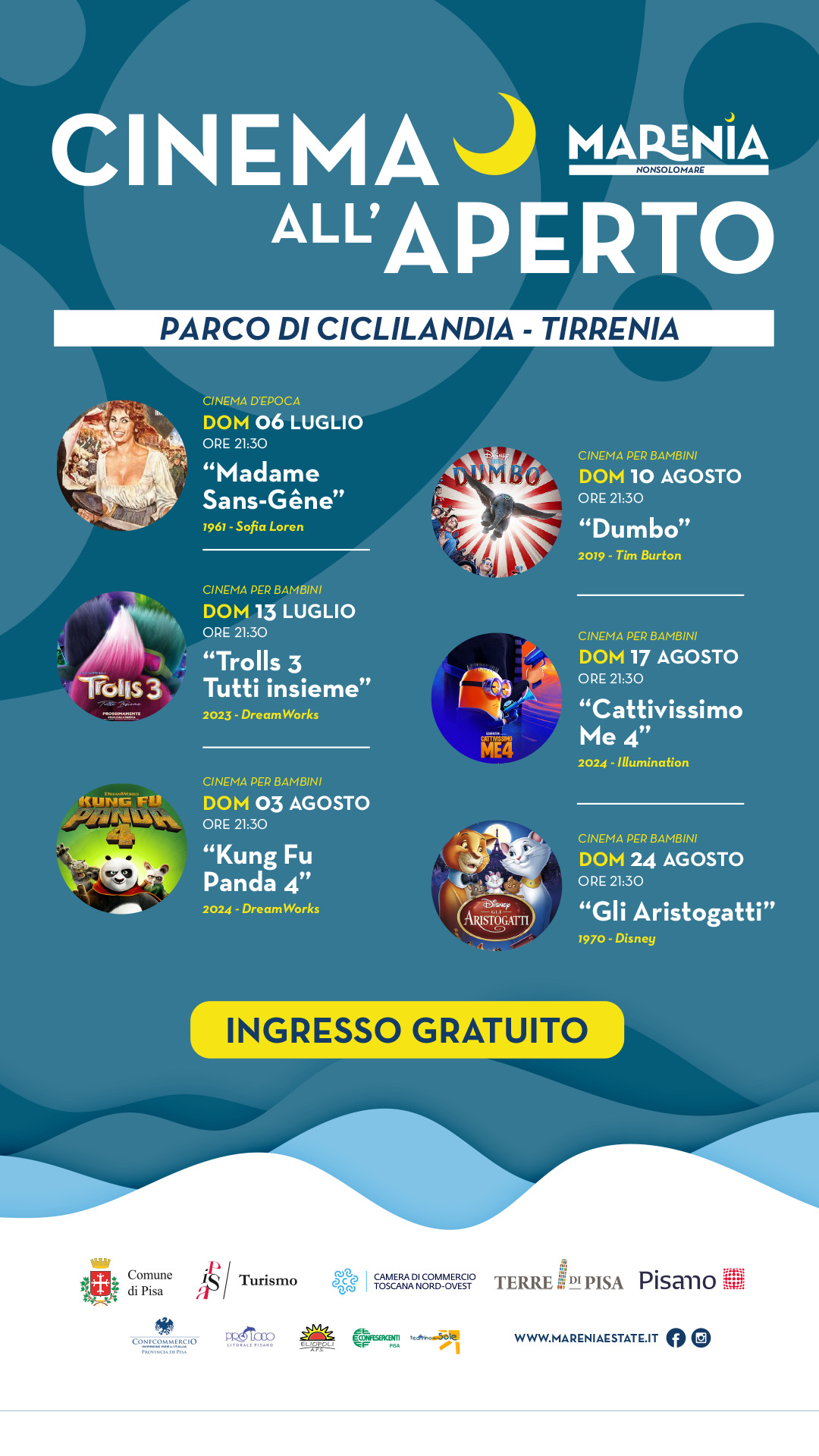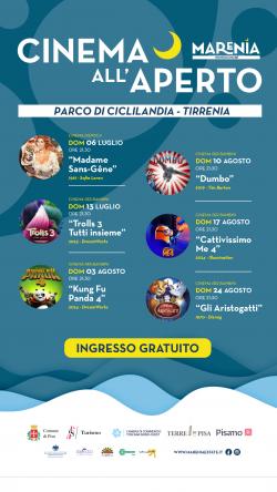 Da domenica 6 luglio a domenica 17 agosto 2025, il Parco di Ciclilandia a Tirrenia ospita il cinema all'aperto, 5 appuntamenti parte del cartellone di "Marenia NonSoloMare 2025" (https://www.turismo.pisa.it/eventi/Marenia-NonSoloMare-2025), iniziativa promossa dall’assessorato al turismo del Comune di Pisa in collaborazione con Pisamo, con la compartecipazione della Camera di Commercio Nord Ovest e il coinvolgimento di Confcommercio Pisa, Confesercenti Pisa, Proloco Litorale Pisano, Teatrino del Sole ed Eliopoli.