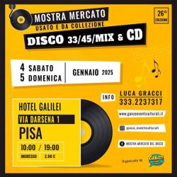 Sabato 4 e domenica 5 gennaio 2025, dalle ore 10.00 alle ore 19.00, presso l'Hotel Galilei, torna la 26° edizione della Mostra del Disco.