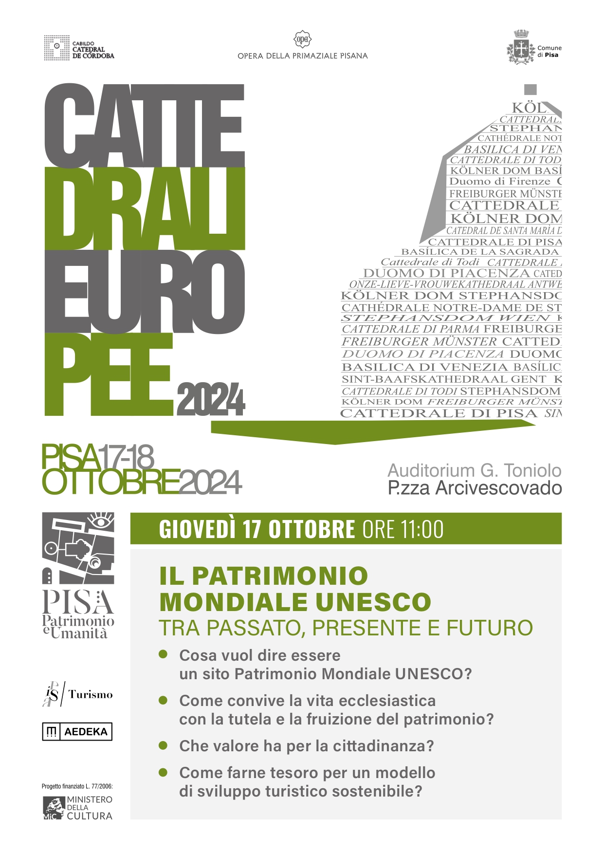 Partner di questa XIII edizione è anche il Comune di Pisa, che ha organizzato la sessione che apre i lavori, subito dopo i saluti istituzionali, dal titolo Il patrimonio mondiale UNESCO tra passato, presente e futuro, che propone una sorta di riflessione sul valore di questa convenzione oggi. In particolare gli interventi analizzeranno alcune questioni importanti, tra cui cosa significa davvero essere un sito Patrimonio Mondiale UNESCO, quali responsabilità comporta e come la tutela di un patrimonio del genere possa e debba convivere con la vita ecclesiastica e con quella cittadina, ma anche come sia possibile farne tesoro per lo sviluppo di un turismo sempre più sostenibile.