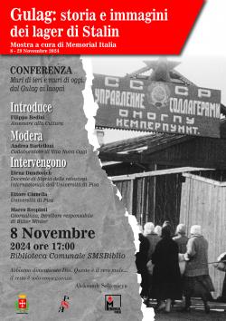 Inaugurata venerdì 8 novembre, alla biblioteca comunale SMS, la mostra “Gulag: storia e immagini dei lager di Stalin” che sarà visitabile gratuitamente fino al prossimo 29 novembre. L’esposizione è organizzata dall’assessorato alla cultura del Comune di Pisa per celebrare il Giorno della Libertà, istituito nel 2005 dal Parlamento italiano per ricordare l’abbattimento del Muro di Berlino del 9 novembre 1989.