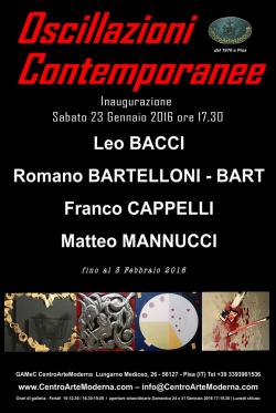 Il pubblico potrà così visionare molte e stilisticamente diverse opere d’arte, ed incontrare un eterogeneo gruppo di artisti (Leo BACCI, Romano BARTELLONI (BART), Franco CAPPELLI, Matteo MANNUCCI) direttamente, partecipando alle emozioni della loro ricerca artistica. Viste le premesse che ogni anno ci spingono a selezionare e proporre nuovi artisti, siamo certi che OSCILLAZIONI CONTEMPORANEE 2016 / OC16 continuerà ad arricchirsi ed a crescere nei prossimi anni, valorizzando così l’opera degli artisti con sicuro incremento sia della cultura che del loro mercato.