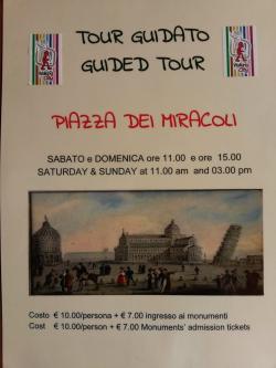 - Alle ore 11.00 Tour Piazza dei Miracoli al costo di 10 € a persona + 7 € per gli ingressi ai monumenti (Cattedrale, Battistero e Camposanto Monumentale). C'è la possibilità di estendere il tour Piazza dei Miracoli e visitare Piazza dei Cavalieri, Piazza delle Vettovaglie, le vie del centro storico fino ai Lungarni per ammirare la chiesa di Santa maria della Spina.