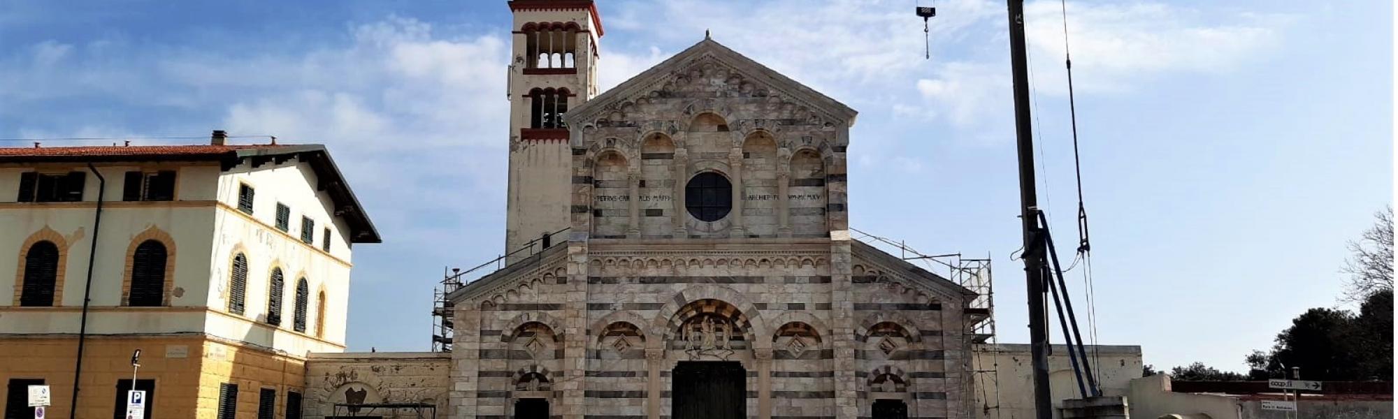 Chiesa di Santa Maria Ausiliatrice (L. Corevi, Comune di Pisa)Edificata su progetto dell'architetto milanese Cecilio Arpesani e su incarico del cardinale Pietro Maffi di Pisa, fu inaugurata nel luglio del 1916 con solenni celebrazioni. La chiesa è costruita in stile neo-romanico e riprende gli elementi dello stile romanico pisano, che nacque nel 1064 con la Cattedrale dell’Assunta in Piazza dei Miracoli: in facciata due ordini con spioventi laterali e un paramento marmoreo che alterna fasce di marmo bianco e nero.