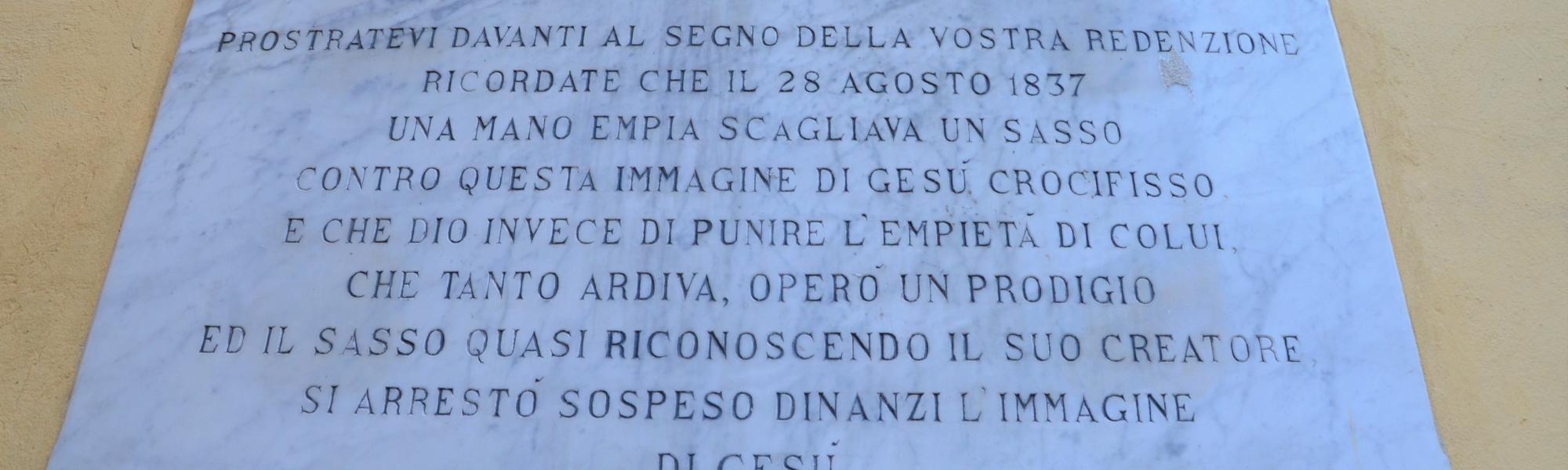 Era il 28 agosto del 1837, quando una mano empia, come riporta l’iscrizione, lanciò un sasso contro il piccolo Crocifisso marmoreo esposto in una nicchia protetta da un vetro. Quasi per miracolo il sasso rimase sospeso dinnanzi all’immagine sacra e il malintenzionato se la dette a gambe. Il sasso fu in seguito riposto accanto al Crocifisso.