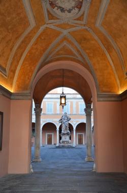 Ingresso palazzo Arcivescovile (L. Corevi, Comune di Pisa)L’arcidiocesi di Pisa comprende una buona parte della provincia, alcune zone delle colline pisane a sud fino a Riparbella e territori della Versilia e della Media Valle del Serchio. L’arcivescovo di Pisa è inoltre, a titolo onorifico, Primate di Corsica e Sardegna. Il primo vescovo documentato fu Gaudenzio, nel IV secolo, e risiedeva nella CurtePiscopi, o Episcopio, dove oggi ha sede l’Arcivescovado. Della Domus Episcopi del 1178, che ospitò FedericoBarbarossa, oggi resta ben poco, dato che l’aspetto attuale è frutto di ampliamenti e restauri compiuti tra il 1461 e il 1473, sotto la guida dell’arcivescovo Filippo de’Medici, che commissionò anche il grande chiostro. Il grande cortile mostra dettagli stilistici tipici della cultura architettonica dell’Umanesimo, ed il palazzo nel suo complesso appare edificato coll’intento di costruire un edificio moderno, ma all’antica. Centro prospettico del chiostro è la statua di Mosè, opera settecentesca di Andrea Vaccà. La facciata fu inoltre restaurata in stile neo-rinascimentale nel XIX secolo. Presso il palazzo si trovava l’antica PortaArchiepiscopatus della presunta struttura difensiva alto-medievale, ormai non più visibile.