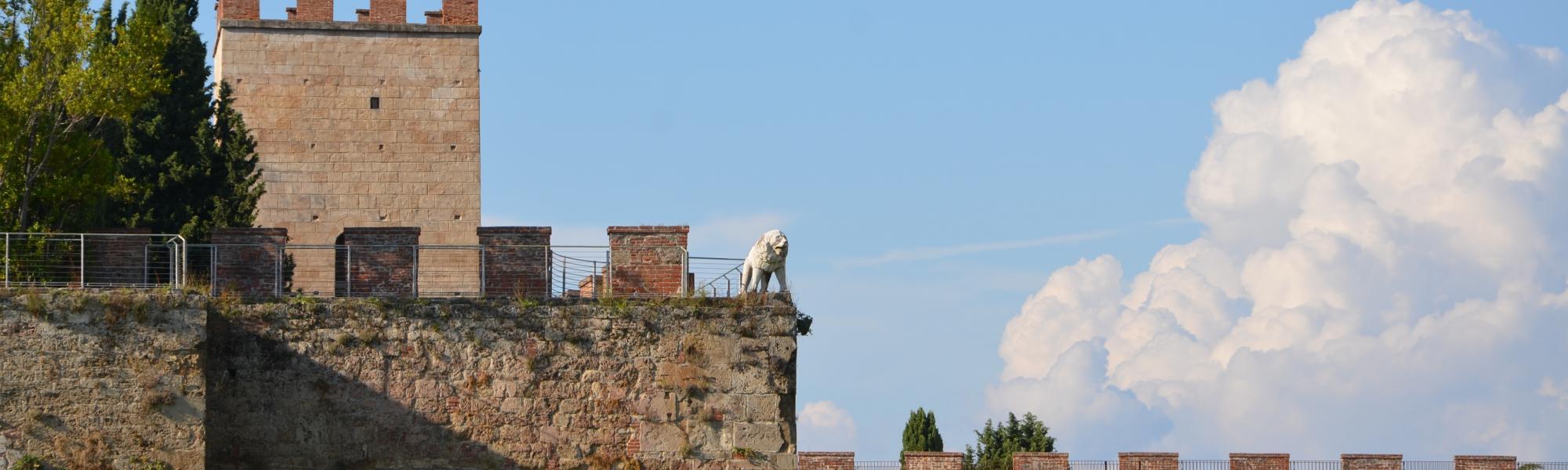 Torre Santa Maria ( da Mura di Pisa, www.muradipisa.it) Detta anche torre sull’Auser, fiume che lambiva questa porzione di mura, la torre Santa Maria, sotto alla quale vediamo l’omonima porta, controllava l’accesso in città e il passaggio di uomini e merci che attraversavano il ponte sul fiume. Nel 1499, durante il secondo assedio fiorentino, anche questa torre fu sbassata all’altezza delle mura. La sua pendenza, visibile dall’esterno, è notevole e risulta ancora più accentuata a seguito della ricostruzione avvenuta intorno alla metà dell’Ottocento. Alla stessa epoca risale probabilmente anche il coronamentomerlato in laterizio. La torre è uno degli ingressi al camminamento in quota.